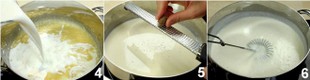 ![]() | BESCIAMELLA SAUCE prepare the sauce in a saucepan put the butter (1), let it melt and add the sifted flour (2) doing it cook for a few minutes, stirring constantly (3) and avoiding to let her take it from sticking or color.you have got what the French call a roux at this point remove the pan from the heat and add the hot milk to the roux (4) mix well with a wooden spoon. Put the pan on the fire then, cook over low heat until the sauce begins to boil and add a pinch of salt and a pinch of nutmeg (5). Cover the pan with a lid and simmer the sauce, over low heat for 15 minutes, the time required to thicken the sauce, stirring occasionally (6). Without this your sauce is ready. |